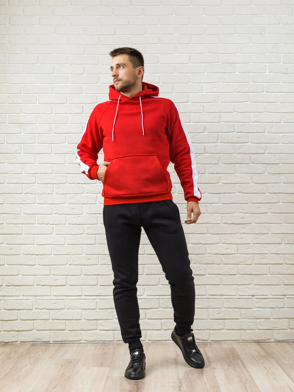 Красная мужская толстовка с капюшоном, теплая худи с лампасами, кофта, кенгурушка / ОСЕНЬ-ЗИМА