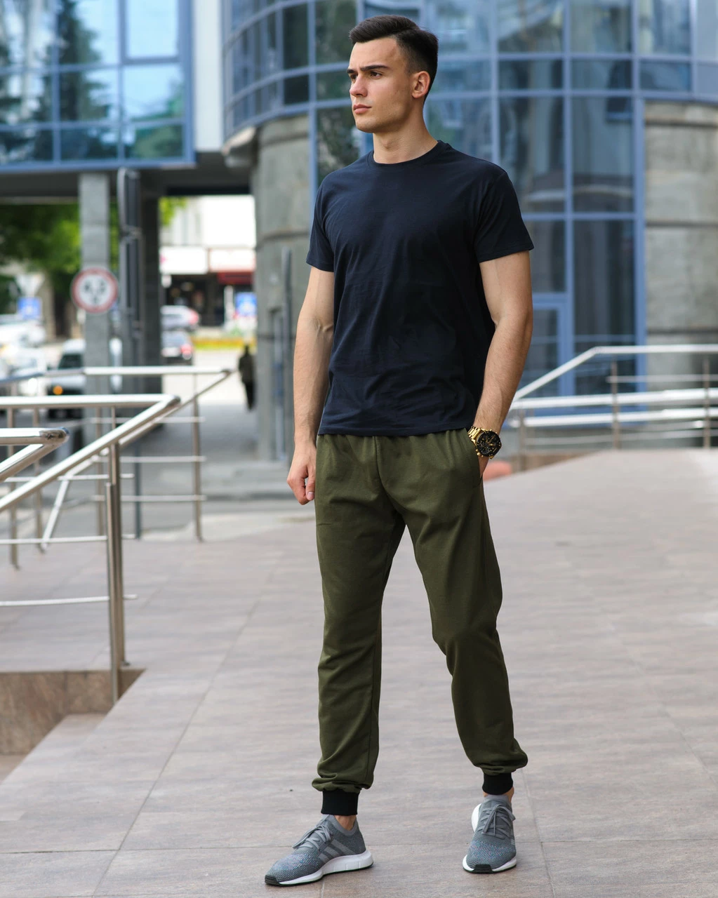Мужской комплект - оливковые спортивные штаны (хаки) и светло-серая футболка (весна/лето/осень)
