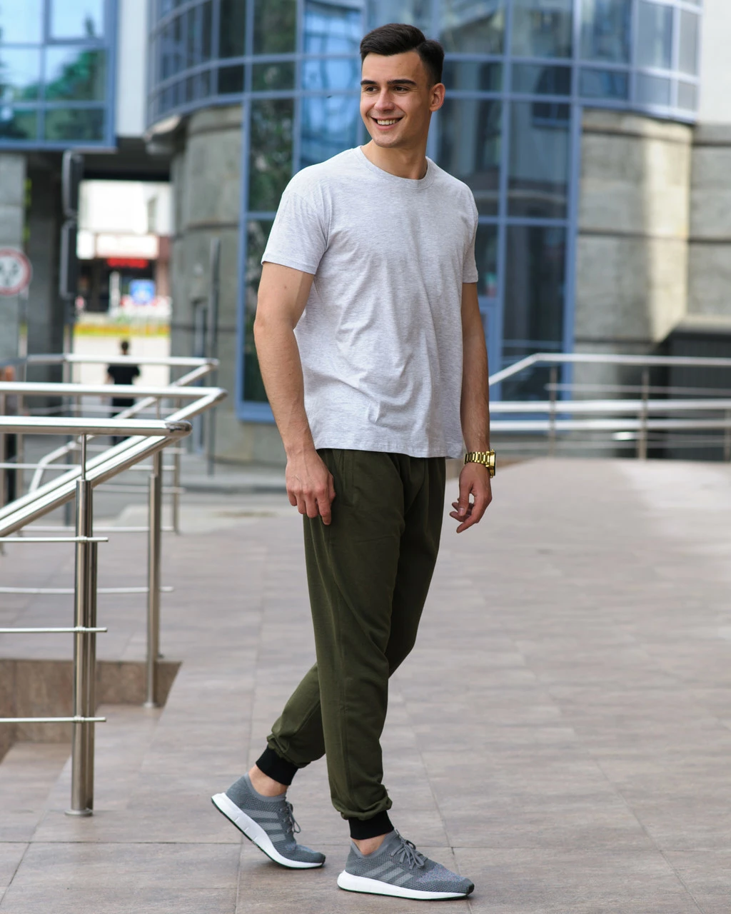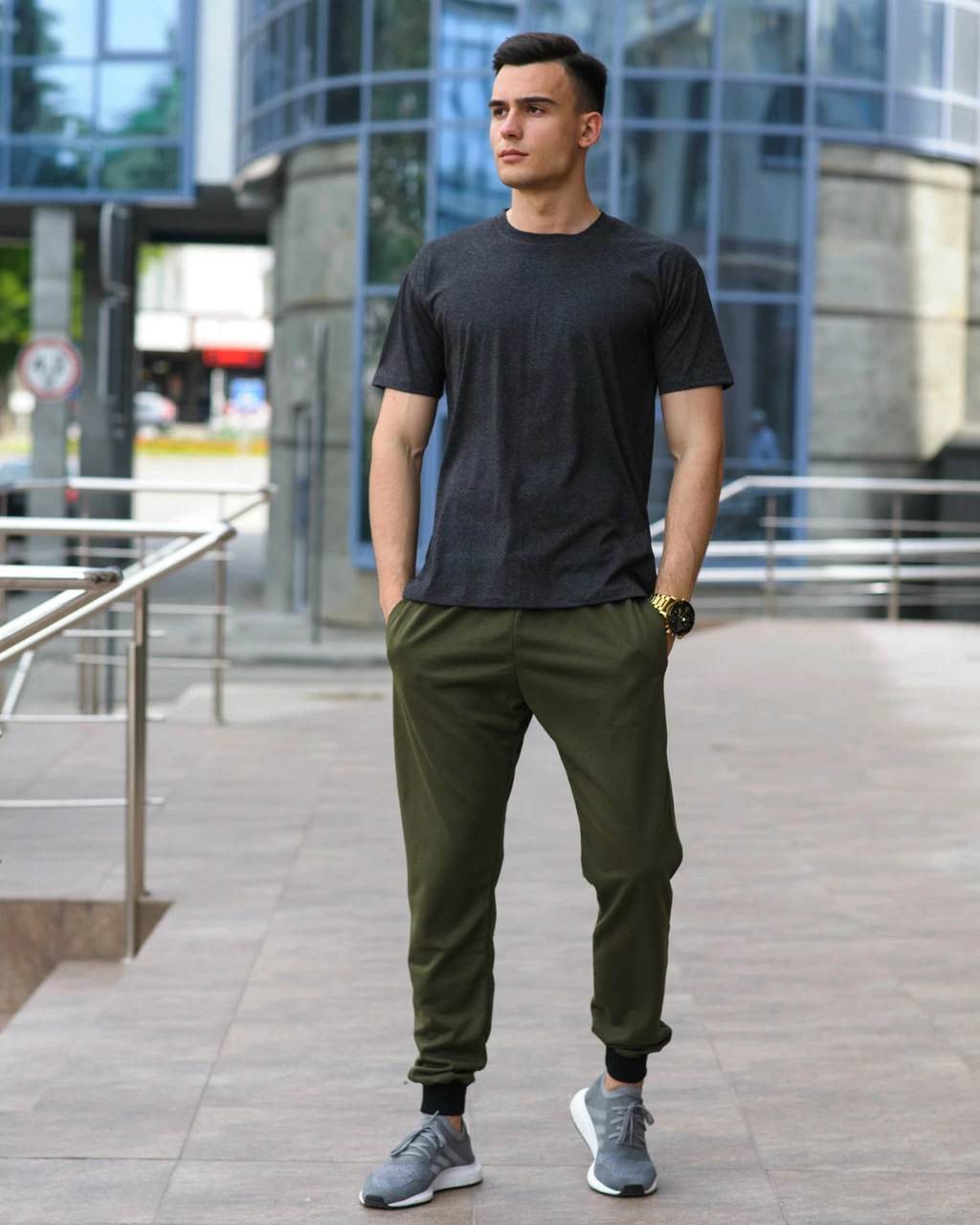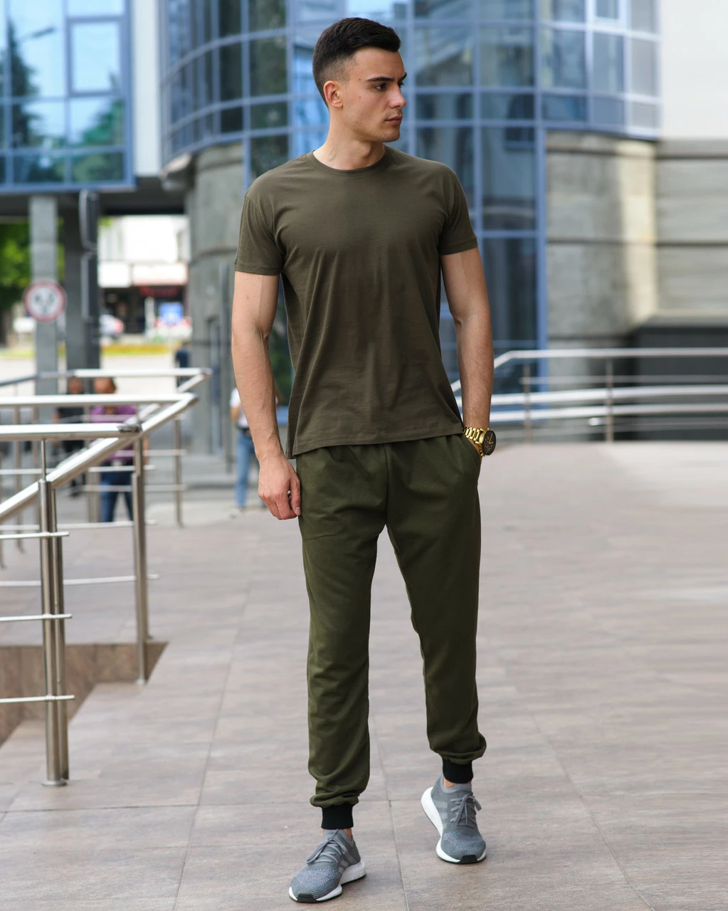 Мужской комплект - оливковые спортивные штаны (хаки) и темно-синяя футболка (весна/лето/осень)