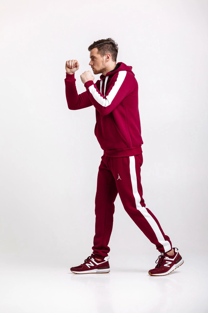 Теплый мужской спортивный костюм, бордовая худи и бордовые спортивные штаны с лампасами (с любым лого бренда)