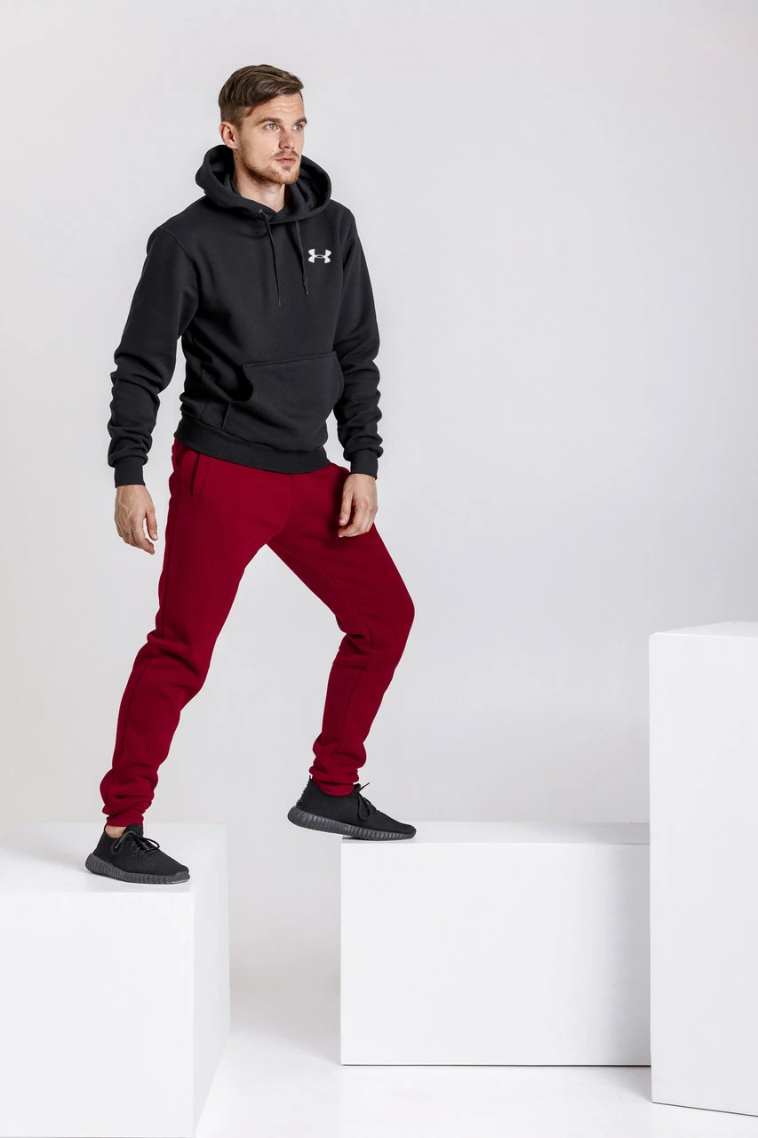 Теплый мужской спортивный костюм, черная худи и бордовые штаны (с любым значком бренда)