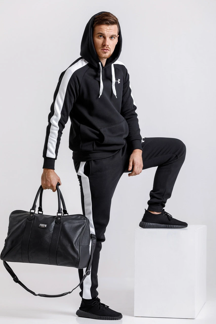 Теплый мужской спортивный костюм, черная худи и черные спортивные штаны с лампасами (с любым значком бренда)