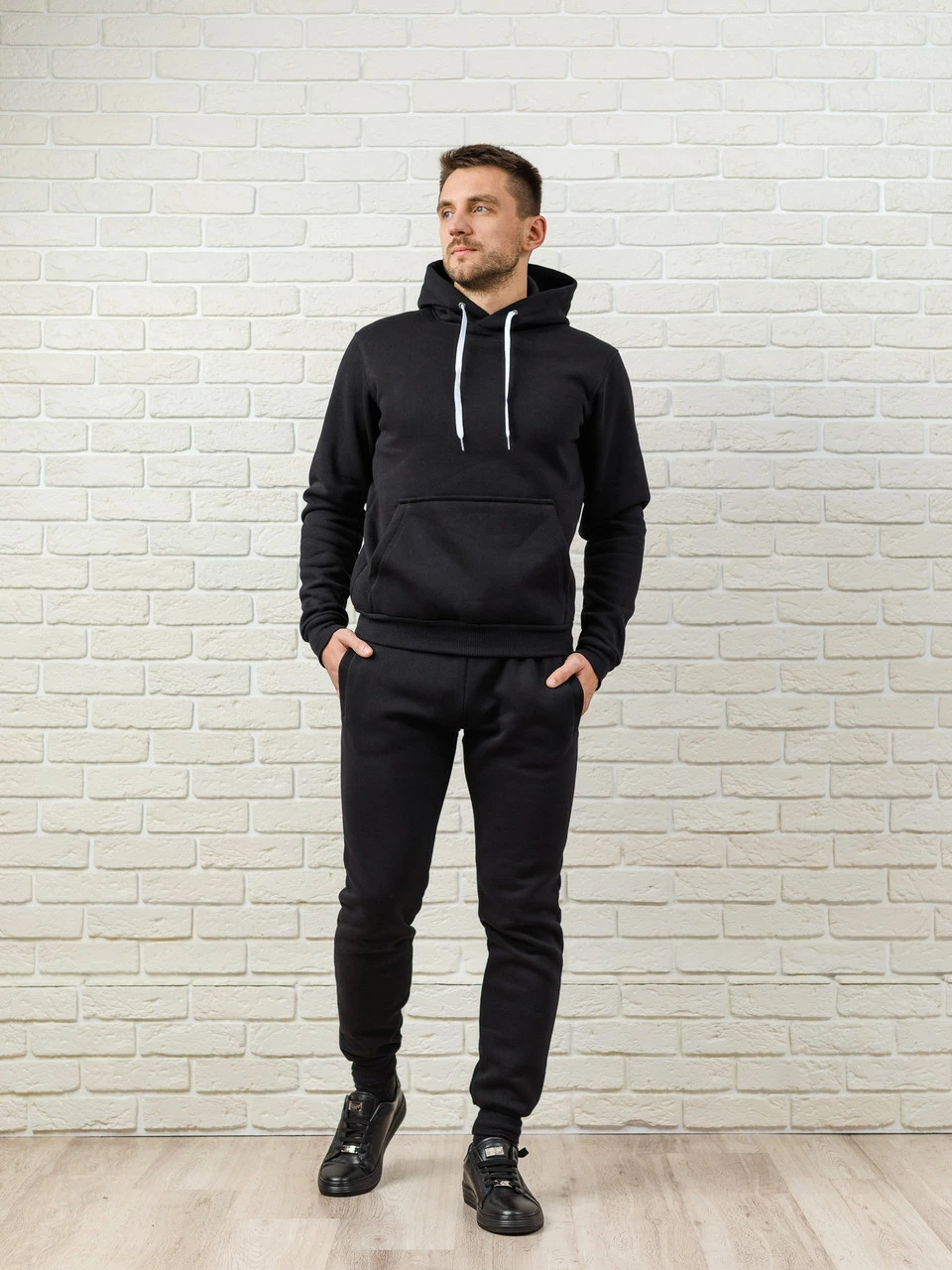 Теплый мужской спортивный костюм, черная худи и теплые спортивные штаны черные