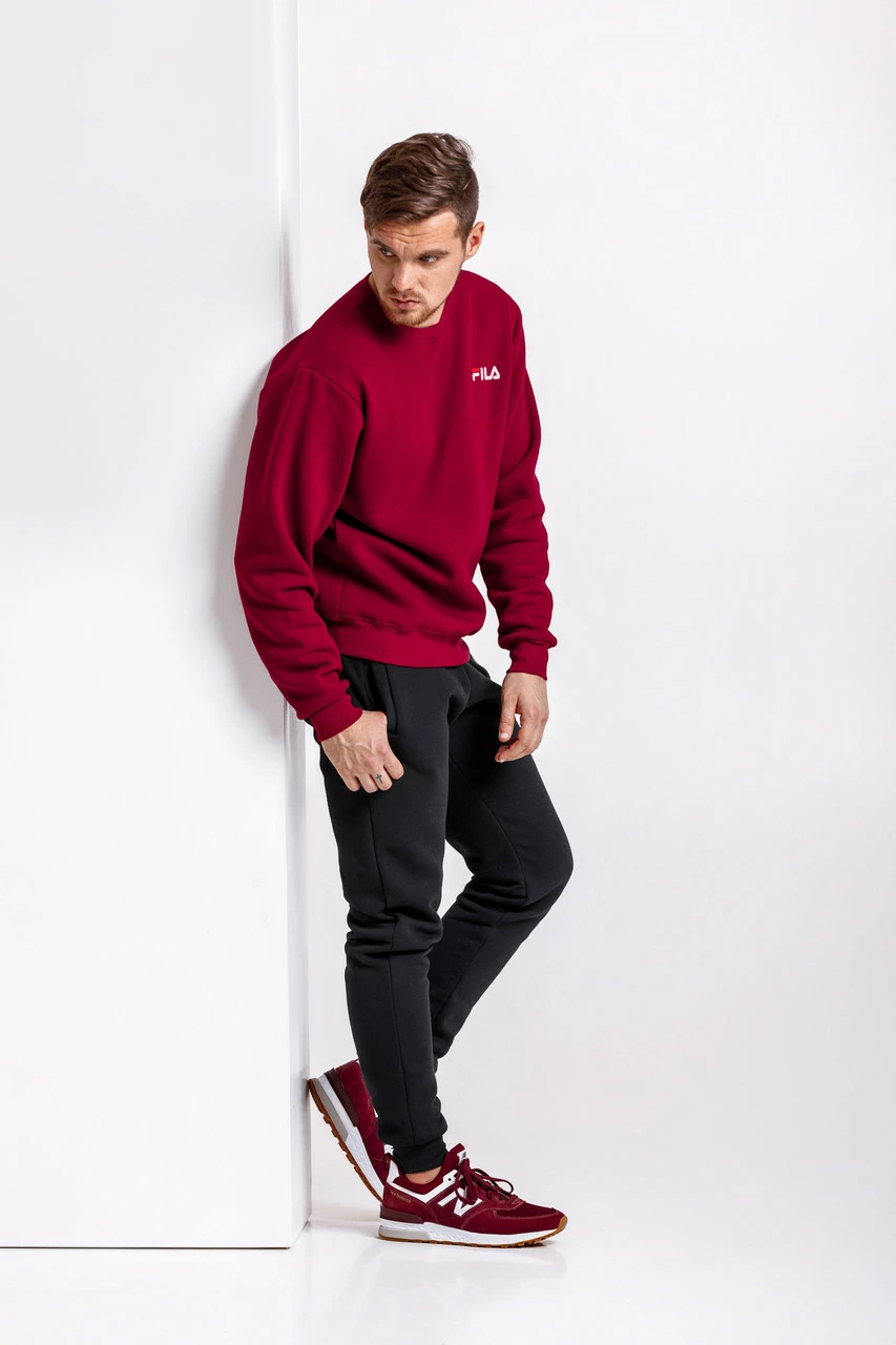 Зимний мужской спортивный костюм - бордовый теплый свитшот, черные штаны (с лого любого бренда)