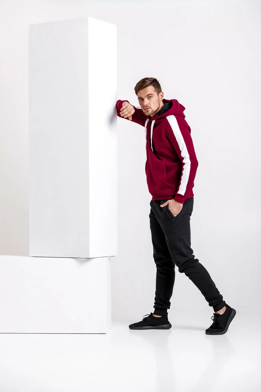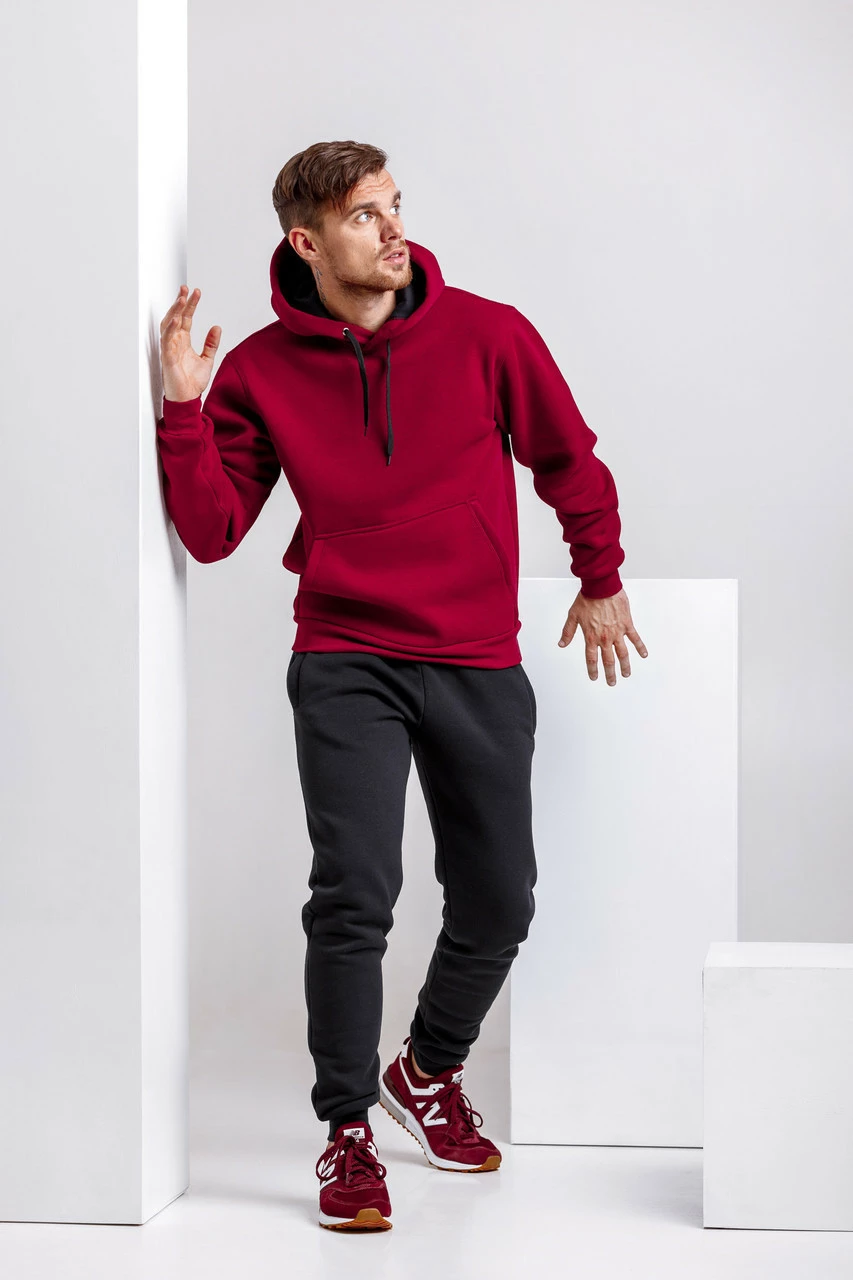 Зимний мужской спортивный костюм - черная теплая худи и бордовые теплые штаны / ОСЕНЬ-ЗИМА
